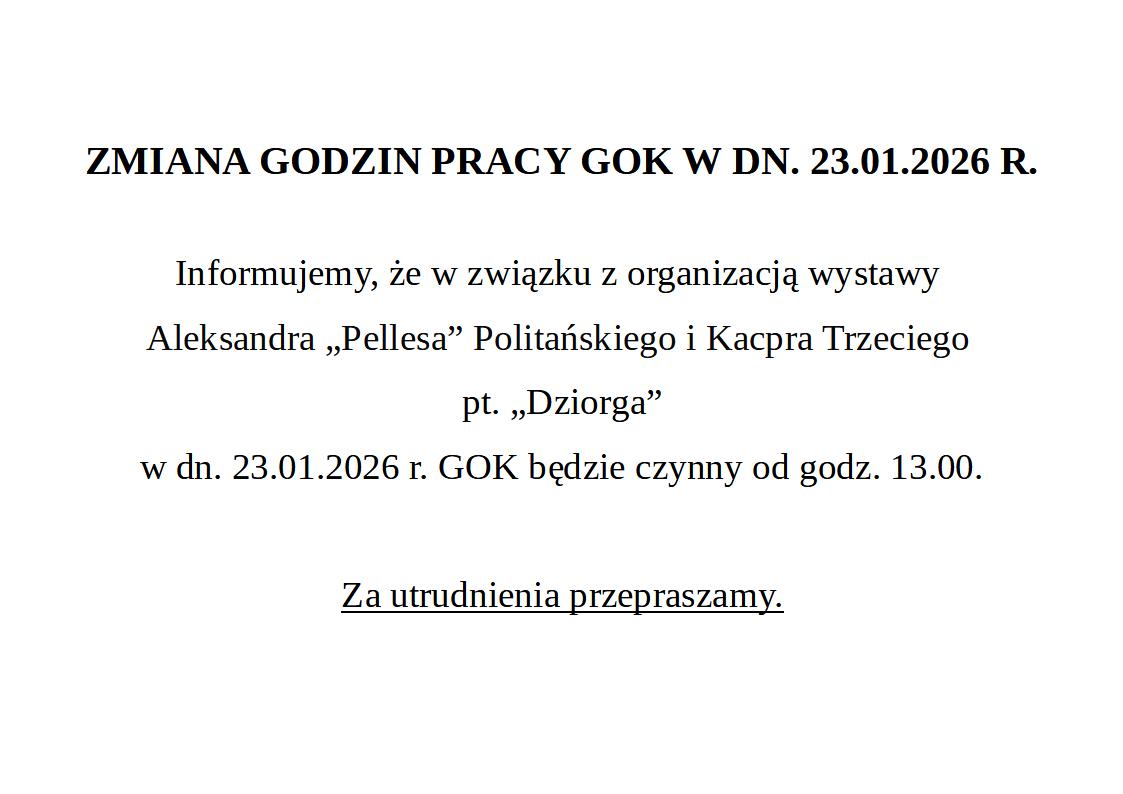 Informujemy, że w związku z organizacją wystawy Aleksandra „Pellesa” Politańskiego i Kacpra Trzeciego pt. „Dziorga” w dn. 23.01.2026 r. GOK będzie czynny od godz. 13.00.