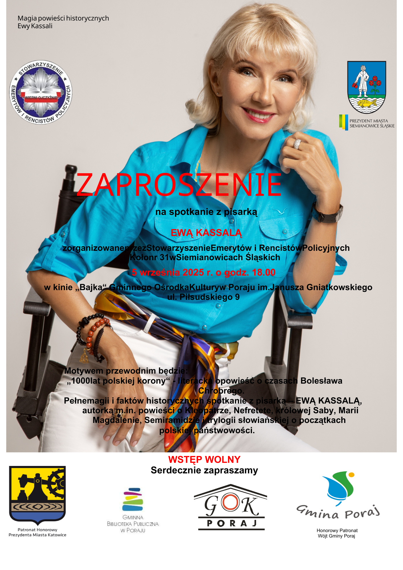Stowarzyszenie Emerytów i Rencistów Policyjnych Koło nr 31 w Siemianowicach Śląskich, Gminna Biblioteka Publiczna w Poraju oraz Gminny Ośrodek Kultury im. J. Gniatkowskiego serdecznie zapraszają na niezwykłe SPOTKANIE AUTORSKIE Z EWĄ KASSALĄ – cenioną pisarką, dziennikarką i ekspertką od wpływowych kobiet w dziejach świata!