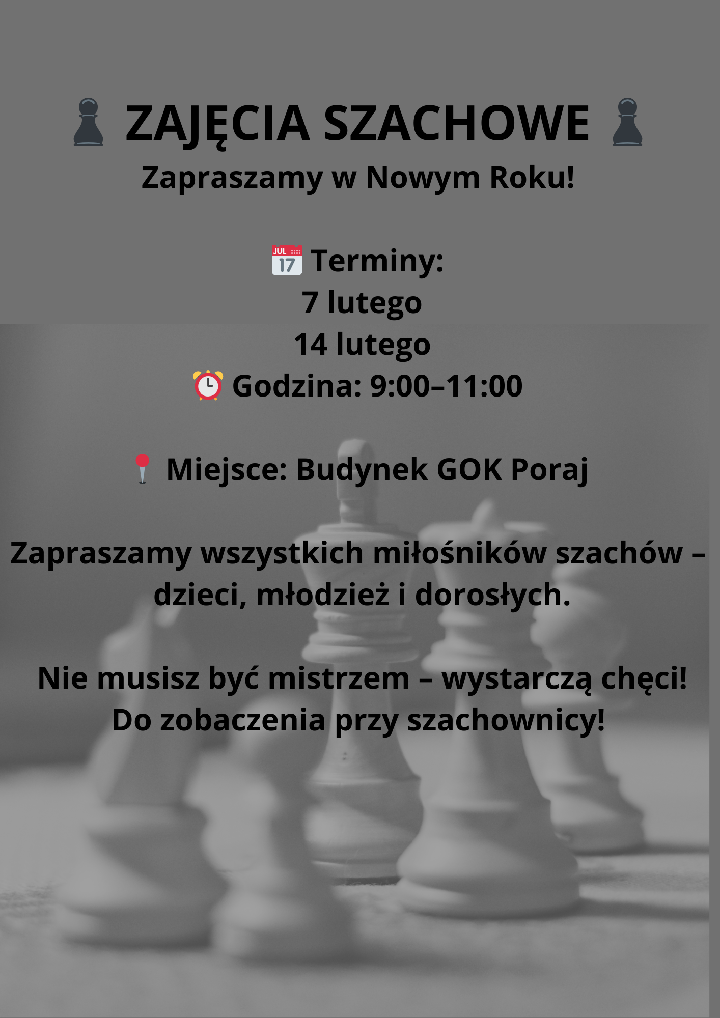 « Wszystkie Wydarzenia To wydarzenie minęło. ZAJĘCIA SZACHOWE W LUTYM 7 lutego @ 09:00 - 14 lutego @ 11:00 « „DZIORGA” – WYSTAWA MALARSTWA I FOTOGRAFII BAL KARNAWAŁOWY DLA DZIECI » + Kalendarz Google+ Eksportuj iCal Szczegóły Start: 7 lutego @ 09:00 Koniec: 14 lutego @ 11:00 Wydarzenie kategoria: Wydarzenia Miejsce GOK Organizator GOK