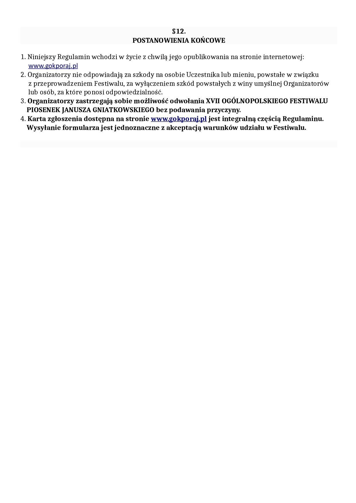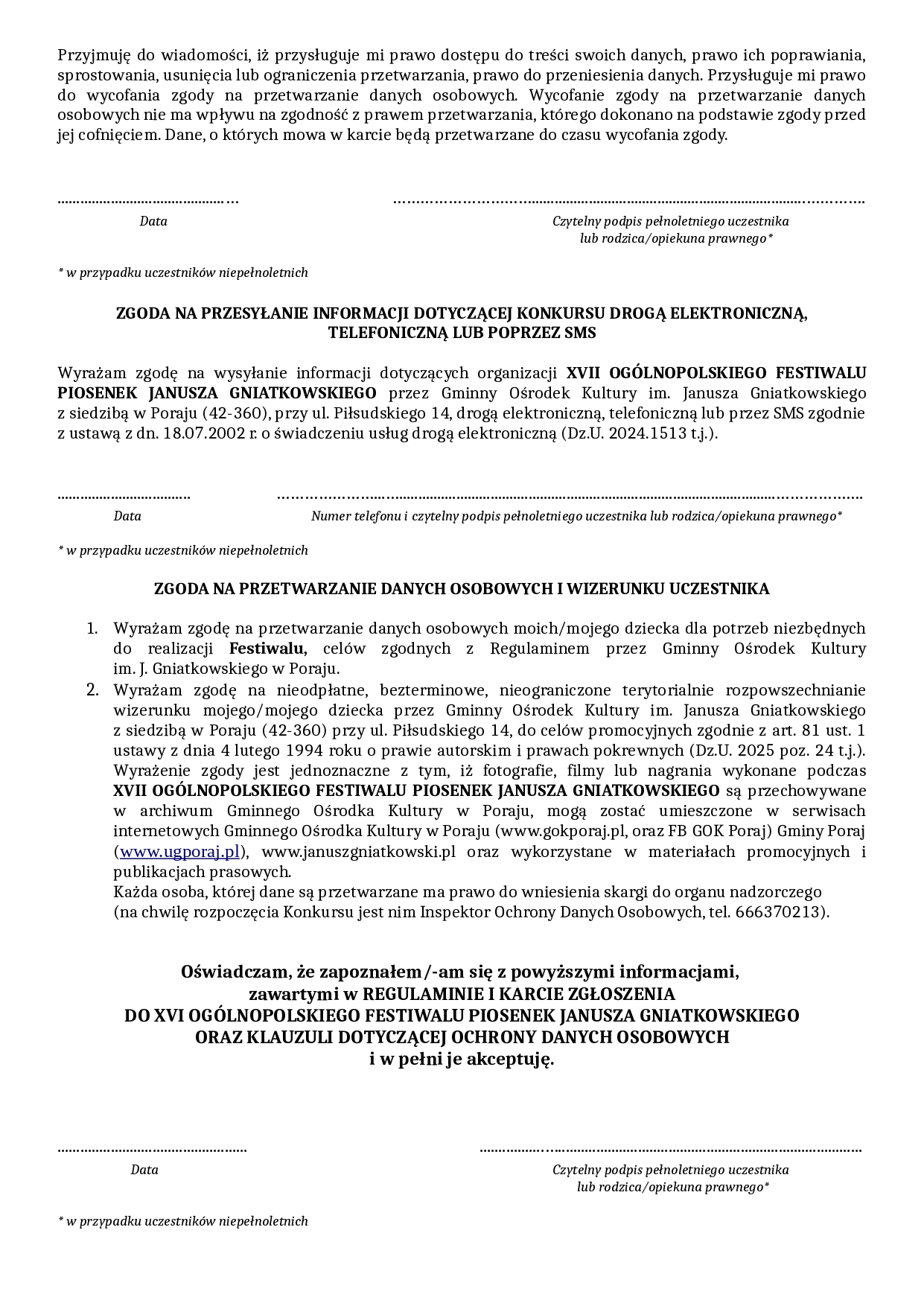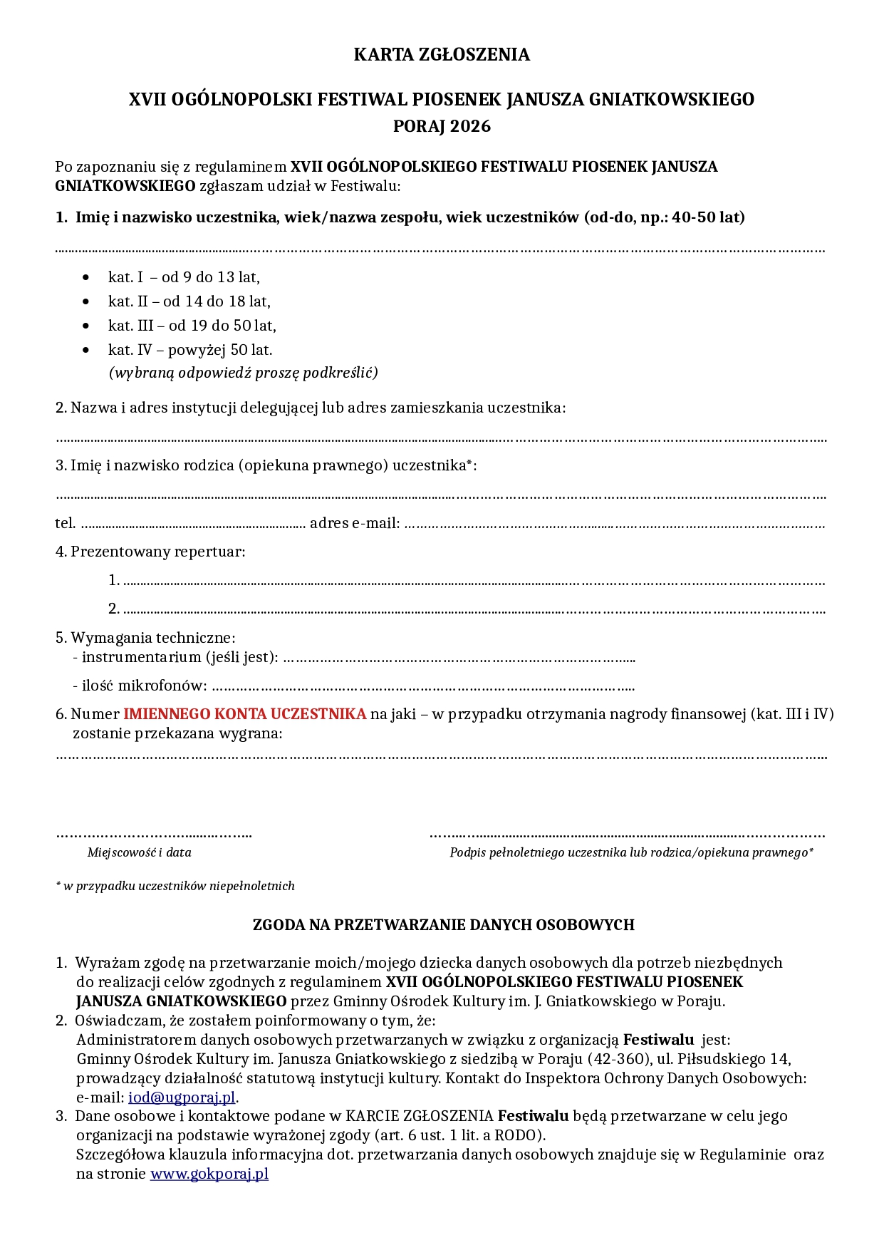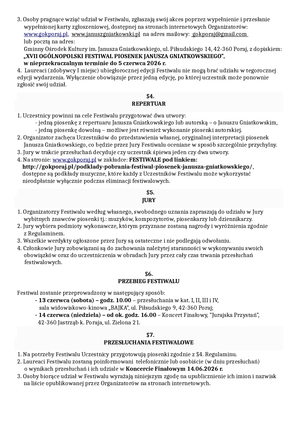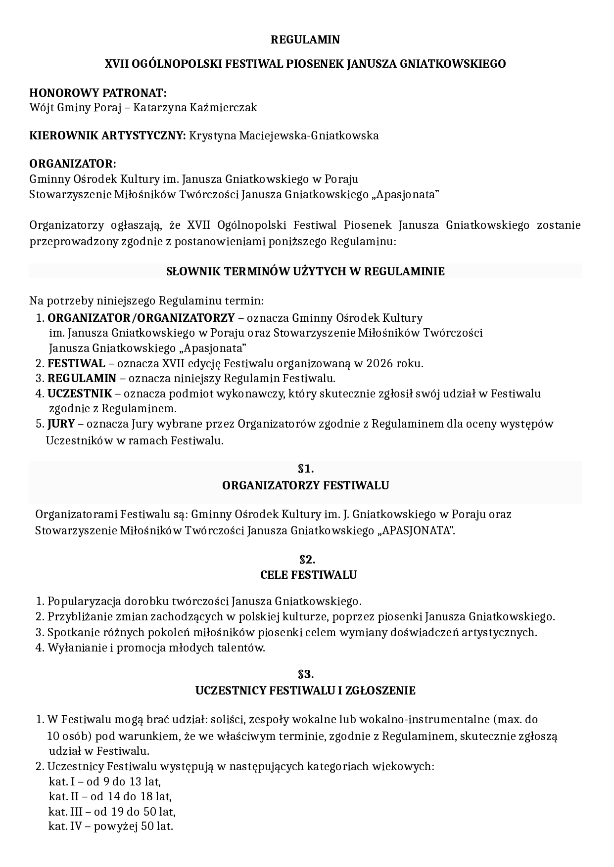 Serdecznie zapraszamy do udziału w XVII Ogólnopolskim Festiwalu Piosenek Janusza Gniatkowskiego.
