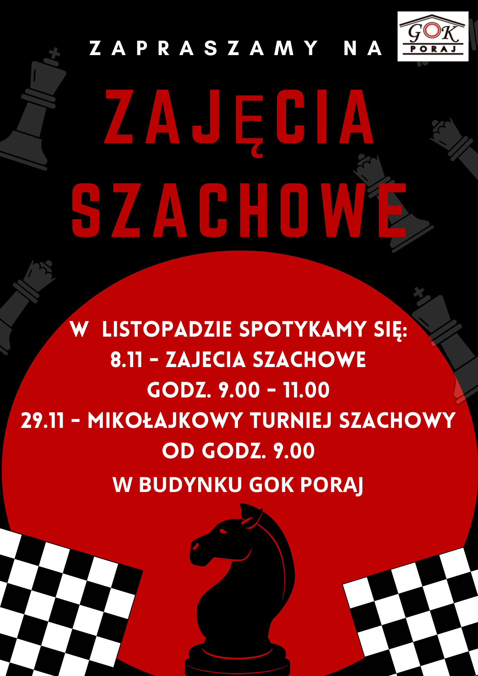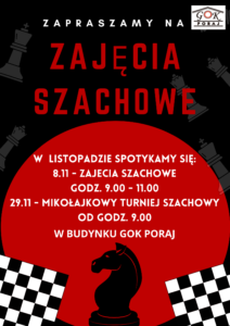 30 paź2025 ZAJECIA SZACHOWE W GOKu Zapraszamy na zajęcia szachowe w listopadzie spotykamy się 08 i 29, godz. 9.00 – 11.00 w budynku gok.