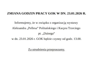 Informujemy, że w związku z organizacją wystawy Aleksandra „Pellesa” Politańskiego i Kacpra Trzeciego pt. „Dziorga” w dn. 23.01.2026 r. GOK będzie czynny od godz. 13.00.